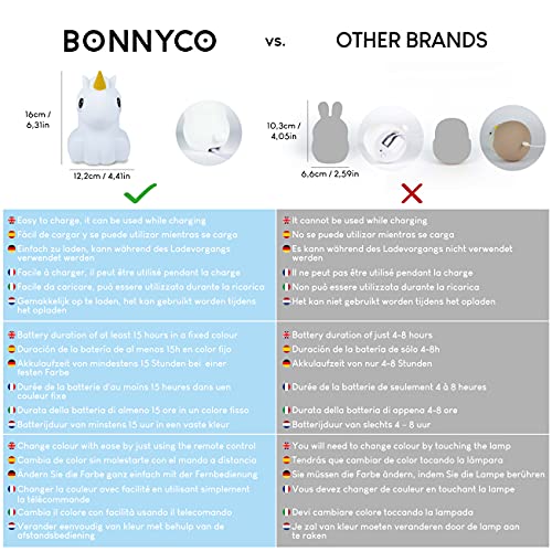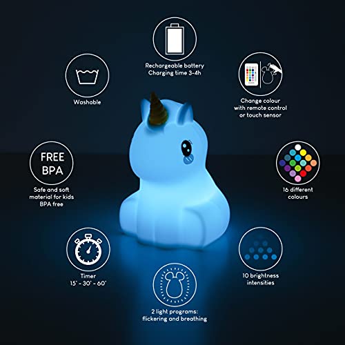 Luz Nocturna Infantil Unicornio con Control Remoto y Táctil 16 Colores – BONNYCO | Lampara Infantil Bebe con Temporizador | Luz Quitamiedos Infantil Silicona 100% Segura, Regalos para Niñas Niños
