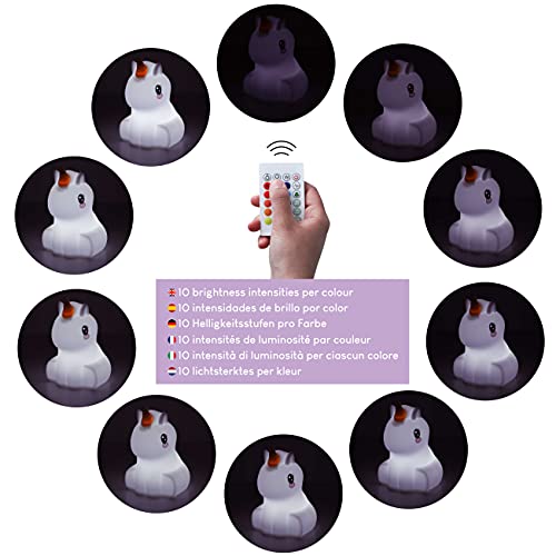 - ? 16 COLORES Y 2 PROGRAMAS ? Lampara quitamiedos infantil de unicornio que cambia de color con mando a distancia y sensor táctil. Con control de hasta 10 intensidades de brillo y programas de parpadeo y transición. Una luz de noche para niños ideal para decoración habitación infantil y regalo original para niñas y niños para Cumpleaños y Navidad