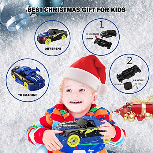 - Experiencia real de carreras: sistema de transmisión de 2,4 GHz, magnífico aspecto, coche de control remoto para niños. El coche de RC tiene un diseño fantástico, equipado con luces LED inteligentes que emiten luz brillante en la oscuridad y produce diversión sin fin a los niños. El coche teledirigido tiene un maravilloso motor y sonido de aceleración realistas, y permite girar 360° tanto al robot como al coche.