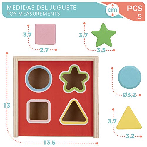 - El juguete incluye 1 caja y 4 bloques para encajar de diferente color y forma: 1 rectángulo rosa, 1 triángulo amarillo, 1 estrella verde y 1 cilindro azul