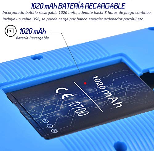 - ?【DISFRUTE LARGO TIEMPO】: consola retro portátil incorporado batería recargable 1020 mAh, ademite hasta 8 horas de juego continua. Y hay un cable USB, se puede carga por banco energía; ordenador portátil etc. Cuando está en un viaje de negocios, viajando, acampando, no tiene que preocuparse por quedarse sin energía.