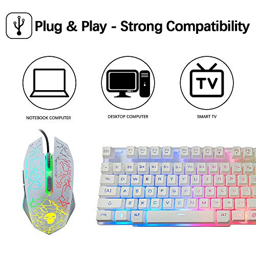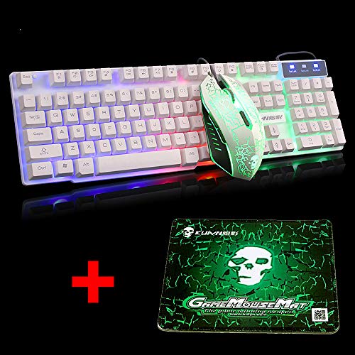 UrChoiceLtd Arco Iris Retroiluminado Ergonómico Teclado De Juego USB + 2400DPI 6 Botones óptico Arco Iris LED USB Ratón De Juego + Gratis Ratón De Juegos 220 * 180 * 5 mm (Luminous Key, White)