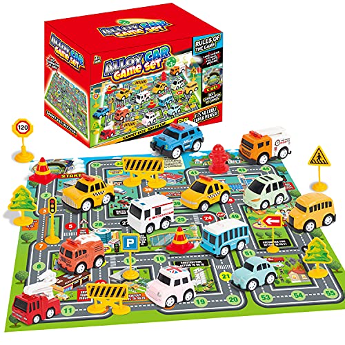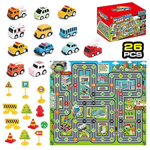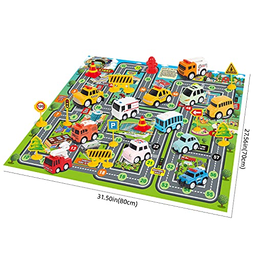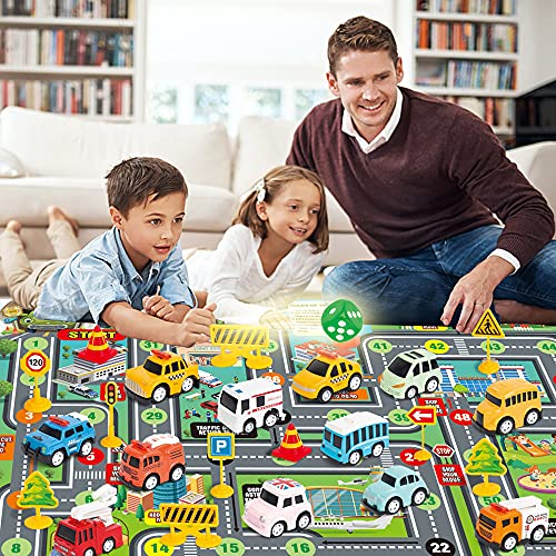- ? 【Juego de juguetes para autos】: 12 autos de retorno, 12 señales de tráfico, 1 tapete de juego de la ciudad, 2 dados, el juego de juguetes para autos se puede jugar individualmente o en múltiples, puede experimentar la diversión de este juego de juguetes para autos con su hijo. El tapete de juego se coloca sobre la mesa y se puede jugar en el suelo.