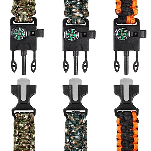 Paracord brazalete Kit juego de 3 para la supervivencia al aire libre, maxin 9 pulgadas Kit de engranaje de supervivencia con brújula integrados, iniciador de fuego, emergencia cuchillo y silbato.
