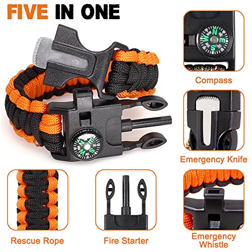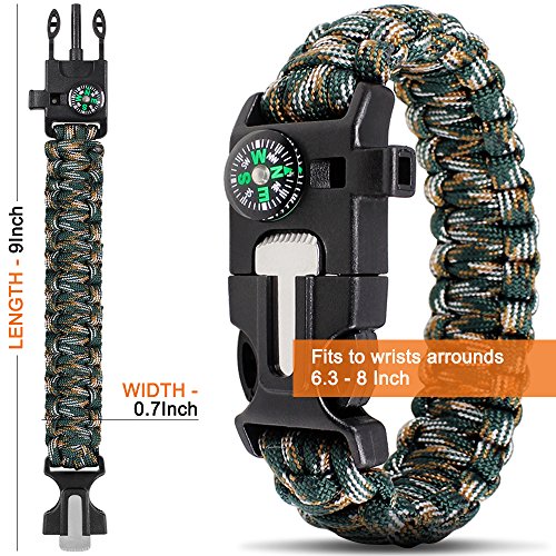 - "5-en-1 herramientas de supervivencia: brújula de alta calidad. Pedernal iniciador de fuego. Scrapper de fuego dentro de la hebilla, utilizarlo también como cuchillo de emergencia. Silbato de emergencia, crea niveles de ruido de hasta 100 dB."