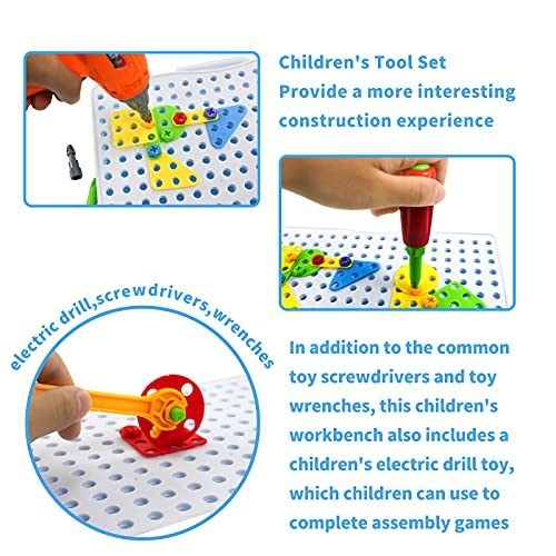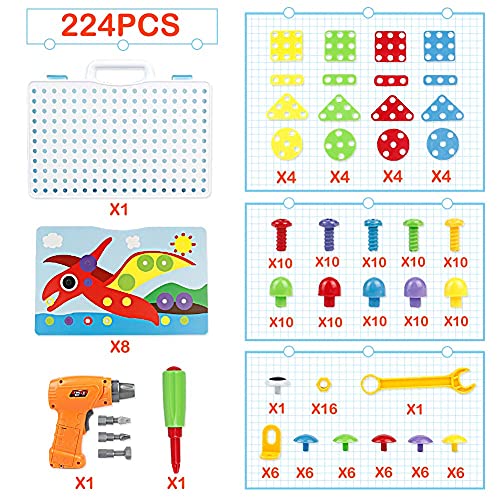 - ??Herramientas de Juguete-- Los niños tienen curiosidad por el mundo, Incluyendo las tareas de ingeniero y papá. Caja herramientas contiene 224 piezas de construcción, incluso taladro eléctrico giratorio(se requieren 2x1.5AA pero no están incluidos), destornillador, clavo de seta y piezas de diferentes colores y formas.