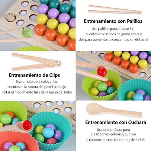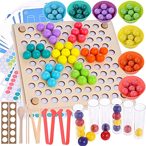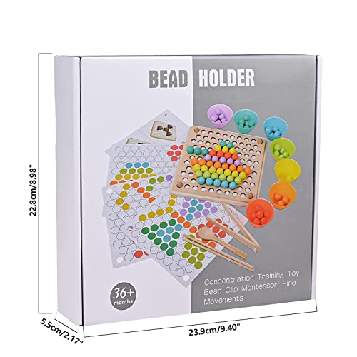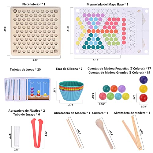 - 【Juguetes de madera natural】1 base de madera del juego, 5 cartón de patrón de base, 77 cuentas redondas de colores, 7 tazones de colores, 1 palillos, 1 cuchara,1 abrazadera de madera, 2 Clip de plástico, 6 Tubo de ensayo , 15 Cuentas de madera grandes, 20 Tarjetas de juego, puedes crear tus propias reglas del juego. Consejo: "TITULAR DE CUENTAS", que en el paquete significa el nombre del producto, no la marca del producto