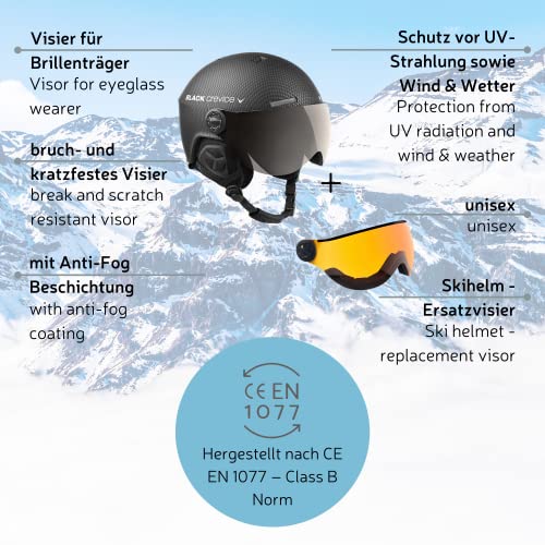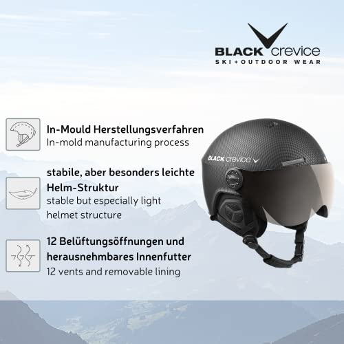 BLACK CREVICE Casco de esquí Gstaad I Casco de esquí con visera en estilo piloto en diferentes colores I para hombres y mujeres I Casco de ski de policarbonato I Casco transpirable I Talla ajustable (M/L (58-61 cm), Negro Carbono)