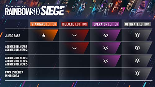 - Vive la experiencia táctica y las posibilidades infinitas de jugabilidad en Rainbow Six Siege con la Operator Edition, que incluye el juego completo, todos los mapas y modos y 38 agentes únicos de los años 1, 2, 3, 4 y 5 de Siege.