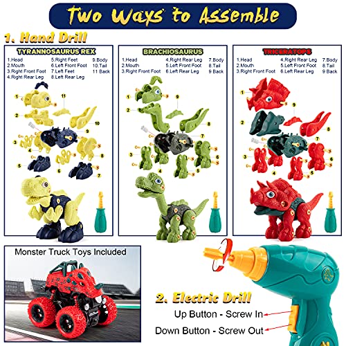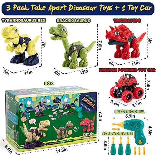 - 【Juguete Dinosaurio】nuestra caja de kit de construcción de dinosaurios contiene 3 tipos de dinosaurios: Tyrannoaurus Rex, Triceratops, Brachiosaurus. Colores vivos, texturas claras que hacen que los dinosaurios sean más realistas. El juguete de fricción vehículo añade diversión adicional. Admite destornillador manual y taladro eléctrico,Practique la habilidad práctica de los niños.