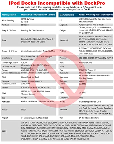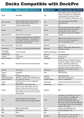 - 【Compatible con más modelos】 El adaptador auxiliar Bluetooth DockPro admite el conector iPod iPhone 30 pines, necesitas verificar si DockPro es compatible con tu estéreo, consulta la lista de adaptación y la lista de no adaptación para obtener más información, DockPro solo admite altavoces con conector de 30 pines, no apto para todos los coches.