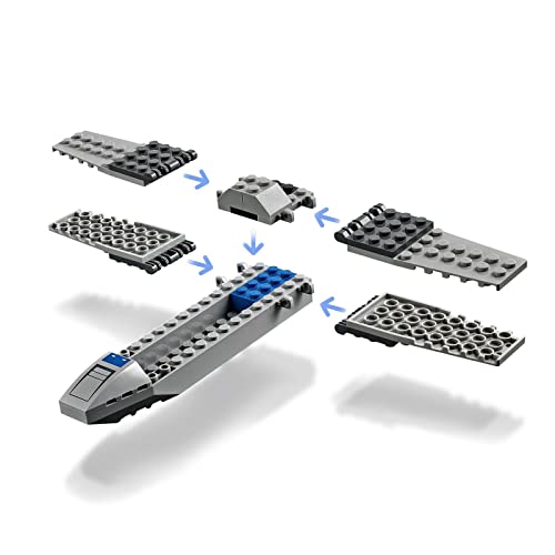 - Las alas de esta lanzadera de juguete para construir se mueven para activar los modos de aterrizaje/vuelo, y la cabina tiene espacio para 2 minifiguras y un almacén para las armas