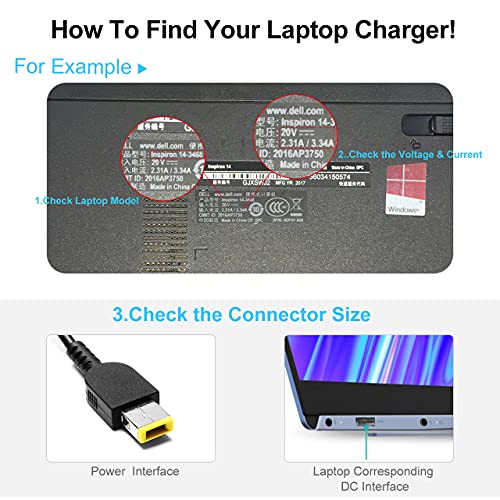- ✅【Cargador para PC Lenovo 65W】Entrada: 100-240V 50-60Hz; Salida: 20V, 3.25A, 65W, Compatible con 20V 2.25A 45W ;Tamaño del conector: conector USB cuadrado