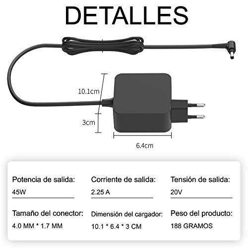 - ⚡ESPECIFICACIONES - Potencia: 45W; dimensión de conexión: 4,0 * 1,7 mm; salida: 20V 2,25A; entrada: 100-240V ~ 50-60Hz, 1,5A; longitud del cable de alimentación para Lenovo: 2m; certificados de CE/ FCC/ ROHS correspondientes. Dispone de múltiples protecciones tales como protección contra sobretensión, sobrecalentamiento y cortocircuito para asegurar una estable salida de corriente al cargar. La cáscara esmerilada impide rasponazo y fácil de enchufar y desenchufar en todo momento