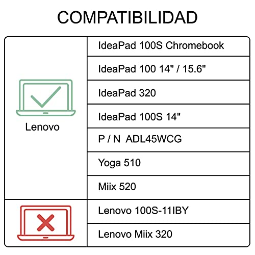 - Adaptador de corriente para Lenovo Ideapad 100 100s 110 110s (14.1" 15.6" modelos sólo) 120 120s 130 130s s130 330 330s 510 510s 520 520s 530 530s S145-14IIL S145-15IIL S145-15IKB S145-14IKB S145-14IGM S145-15IGM S340-15IWL S340-14IWL 100S-14IBR 100-14IBY 100-15IBD 100-15IBY 110-15IBR 110-151BR 110-15ACL 110-15IBR 110-151BR, 310-15IAP, 320-14IKB, 320-15ABR, 320-15AST, 320-15IAP, 320-15IKB, 320-17IKB, 320S-14IKB, 320S-15IKB, 330S-15ARR, L340-15IWL, 510-15IKB, 510-15ISK 510S-14ISK, 520S-14IKB