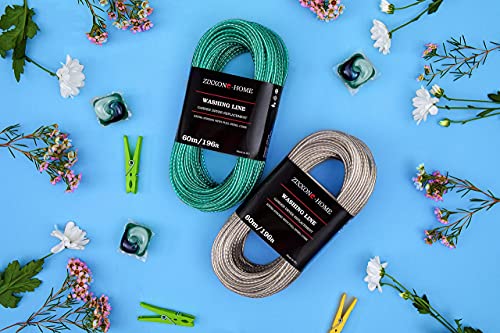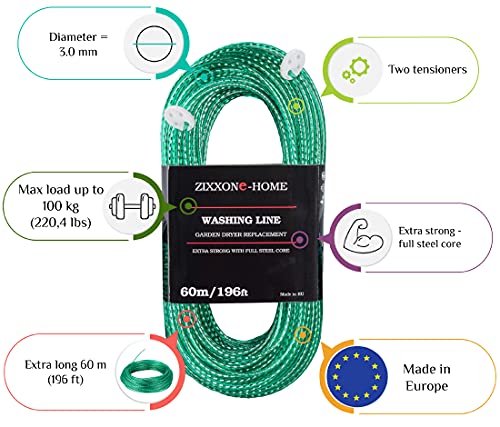 ZIXXONE-HOME Cuerda de Tender Ropa 60 m con 2 tensores Línea de lavado resistente Cuerda extra larga extra fuerte exterior Secador giratorio de jardín Línea de repuesto núcleo de acero completo Verde