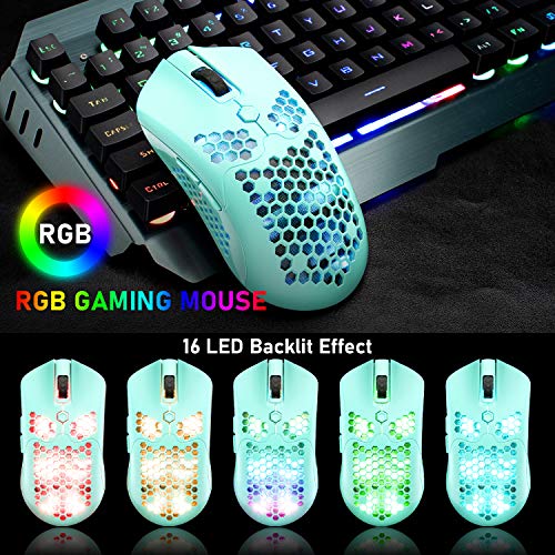 - 【16 Ratón para juegos con retroiluminación RGB】 Este mouse de computadora tiene 16 efectos de retroiluminación diferentes, que pueden satisfacer sus diferentes necesidades de retroiluminación. Puede cambiar la luz de fondo a través del botón en la parte posterior del mouse o establecer el color que necesita a través del software del controlador.