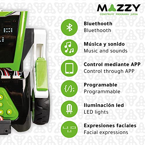 - 2 EN 1: Mazzy es un robot juguete que cuenta con 100 piezas de montaje. Este robot para montar tiene 2 opciones de montaje, vehículo o robot. Se puede programar desde el panel de control o desde la app.