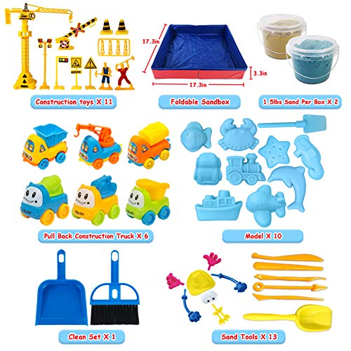 - Este divertido juego de juguetes de arena mantendrá a tus hijos entretenidos durante horas; la caja contiene 3 libras de arena (color arena original y azul), un juego de juguetes de construcción (grúa, figuras, placas, cono y accesorios), 6 minivehículos de construcción, 10 formas de animales, 10 herramientas de modelado, herramientas limpias y una caja de arena plegable