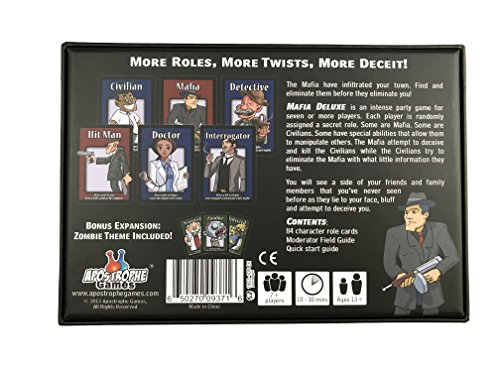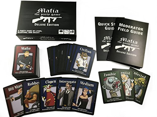 - Mafia Deluxe cuenta con 47 roles únicos en 84 tarjetas de rol, una guía de campo para moderadores y una guía de inicio rápido
