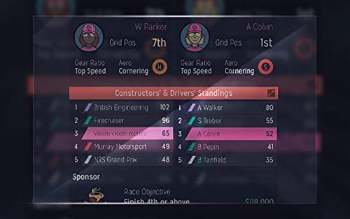 - Este es tu equipo de competición. Contrata conductores, diseña tu coche e invierte en tecnología.