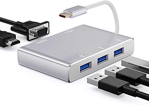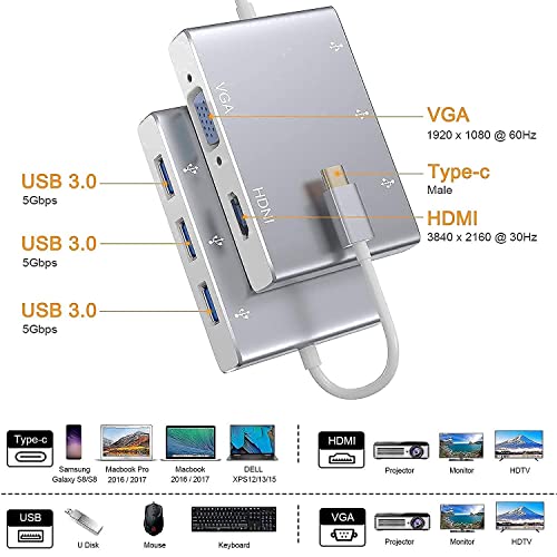 - 【Adaptador multipuerto USB tipo C 5 en 1】 este concentrador portátil 5 en 1 proporciona tres puertos USB 3.0, puerto HDMI 4K y puerto VGA 1080P, lo que le permite conectar tres dispositivos al mismo tiempo, reemplazando el dise?o de puerto único de o Chromebook ; Conecte un monitor, proyector, teclado, mouse o unidad de disco USB a una computadora portátil u otro dispositivo tipo C con una sola salida USB-C