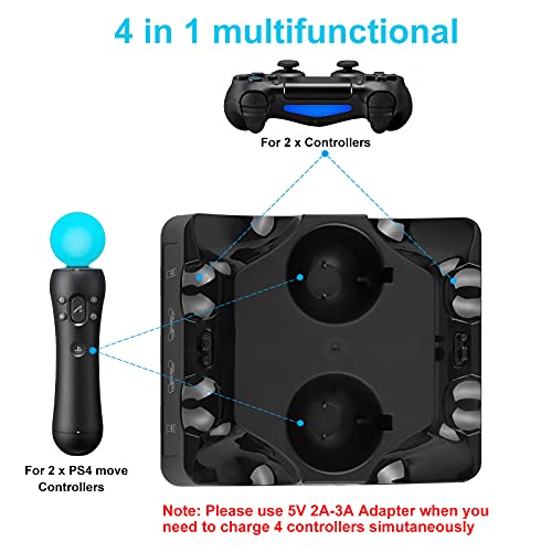 - 【MULTIFUNCIÓN 4 en 1】: Permite el almacenamiento y la carga seguros de dos controladores y dos PS MOVE al mismo tiempo. También es un lugar de descanso ideal para los controladores de PS4 cuando no estás jugando. Si necesita cargar cuatro dispositivos al mismo tiempo, utilícelo con un enchufe de alimentación superior a 5 V 2 A
