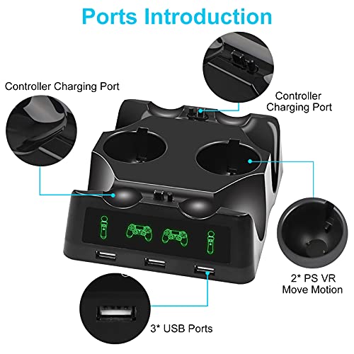 - 【COMPATIBILIDAD】:Este cargador de controlador de PS4 es adecuado para el movimiento de PS4, el mango inalámbrico de PS4 (no funciona con el controlador de ps3) 3 puertos USB adicionales le permiten no solo guardar su juego en el almacenamiento de datos, sino también cargar su teléfono o dispositivo electrónico mientras disfruta de su juego.