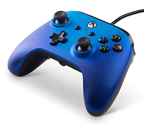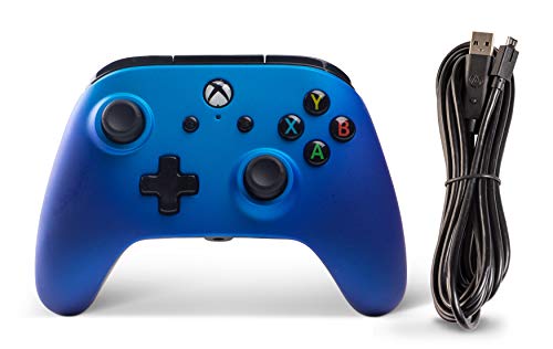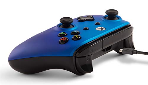 - Botones de control avanzado de juego Formato familiar nuevo Diseño satinado metalizado difuminado en color azul Con licencia oficial para Xbox One Motores de doble vibración Conexión de auriculares estéreo de 3,5 mm Cable USB extraíble de 3 metros