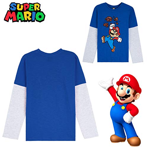 Super Mario Camiseta Niño, Camisetas de Manga Larga Azul y Roja con Mario Bros, Ropa para Niño de Algodon, Regalos para Niños y Adolescentes 3-13 Años (3-4 años, Azul/Gris)