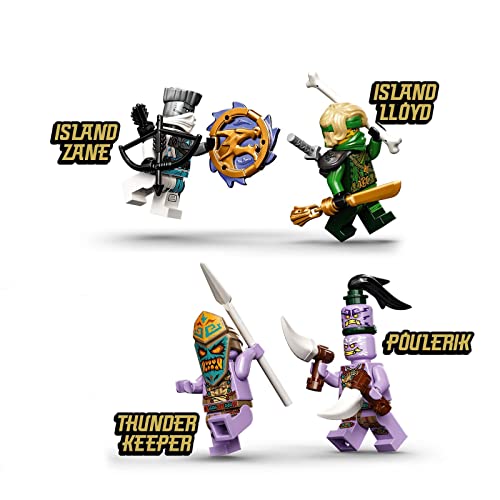 - Viene con 4 mini figuras de la serie para televisión LEGO NINJAGO: Lloyd de la Isla, Zane de la Isla, PoulErik y el Guardián Trueno, todas equipadas con impresionantes armas para que las batallas sean aún más divertidas.