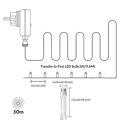 - ★ Longitud: La cadena de luces de hadas mide 33 metros de largo (con el cable de plomo de 3 metros) y dispone de 300 LEDs
