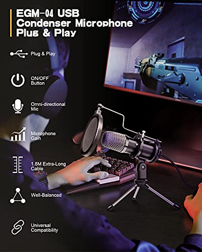 - [Micrófono omnidireccional de condensador & Micrófono PC con interruptor]: micrófono USB para PC EGM-04 es un micrófono omnidireccional de condensador con calidad de sonido clara, grabación de sonido original, defensa aérea y sin ruido. Puede recibir sonido normalmente sin estar demasiado cerca. Con el interruptor puede encender y apagar el micrófono en cualquier momento.