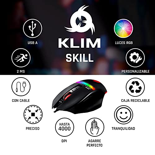 KLIM Skill Ratón Gaming de Alta Precisión USB - Nueva 2021 Versión – dpi Ajustable – Botones Programables – Cómoda Postura para Todos los Tamaños de Manos – Excelente Agarre Negro