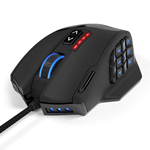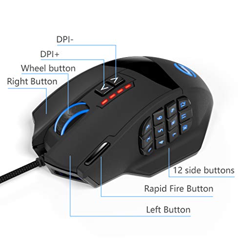 - ❖ DISEÑO DE GAMA ALTA. El Mouse Redragon M908 dispone de 7 botones y 12 botones laterales programables para MMOs. Los paneles inferiores acolchados resistentes y suaves TEFLON ofrecen el mejor control para sus juegos. El cable de fibra tejida de 6 pies con conector USB chapado en oro asegura una mayor durabilidad.