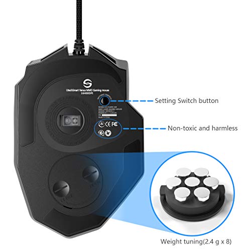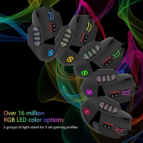 - Multifunción: 18 botones programables, 12 botones laterales, 5 juegos de perfiles de juegos de memoria programables y almacenables que se diferencian con colores claros. 8 x 2.4 g de peso que puede aumentar / disminuir arbitrariamente. Más de 16 millones de opciones de color LED RGB. También puede decidir si usa el LED.