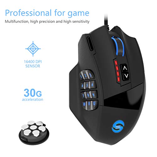 Bawanfa Ratón Gaming con Cable Profesional 16400 dpi, Ratón láser para Juegos MMO, 18 Botones Programables 12 Botones Laterales, Peso Ajustable, luz de Respiración Personalizada