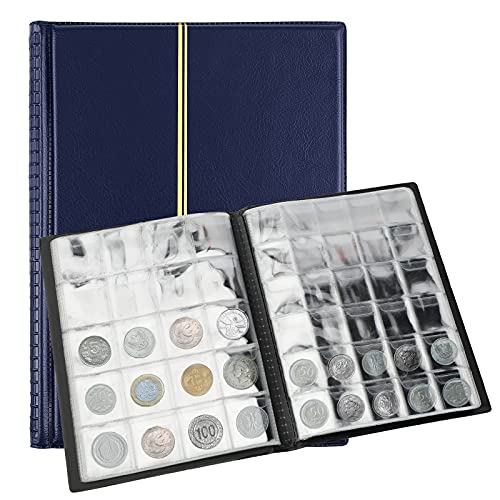 SAVITA Álbum de Monedas de 250 Bolsillos Libro de Colección de Monedas de Cuero de 10 Páginas Libro de Colección de Peniques para Coleccionistas de Monedas (Azul Profundo)