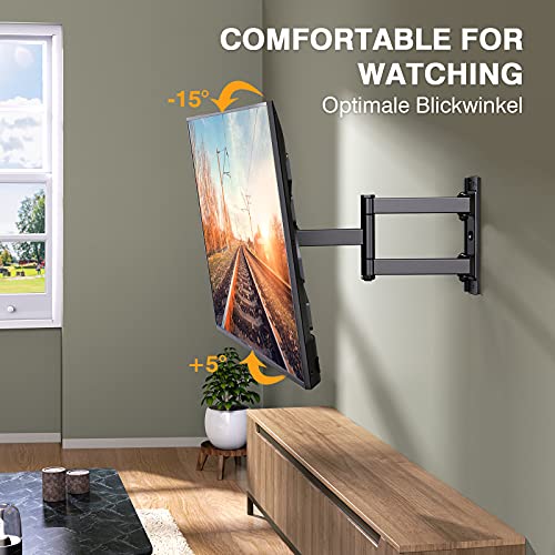 - AHORRE MÁS ESPACIO: Un soporte de pared articulado para TV con un brazo que se tira a 5 cm de la pared en la posición de inicio para ahorrar espacio y que también se extiende hasta un máximo de 36 cm desde la pared. Ahorre un espacio valioso y agregue un aspecto elegante y elegante a su hogar