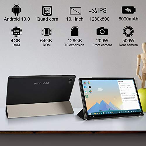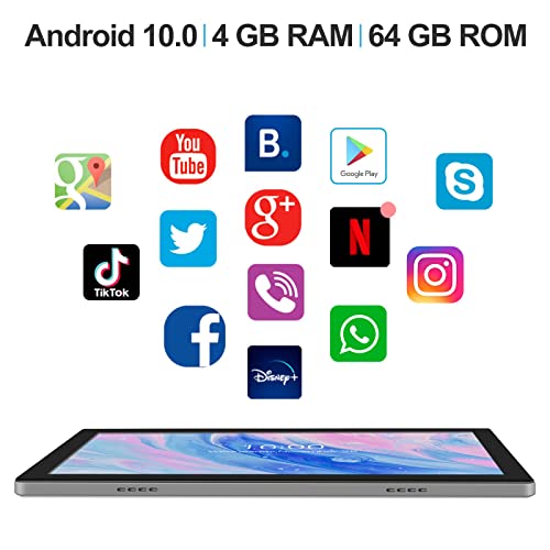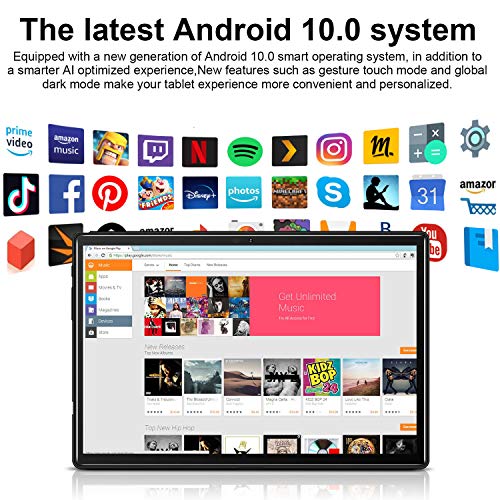 - [Pantalla HD]: Tableta Android 10.0 con resolución de pantalla IPS brillante grande HD 1280 * 800 de 10.1 pulgadas que ofrece colores precisos, contenido rico y nítido, y admite juegos, videos, Facebook, Twitter, MSN, Skype, Netflix, YouTube, Instagram , Gmail, Yahoo Mail, Hotmail, Surf Web y otros sitios de videos, que brindan una excelente experiencia de visualización para fines comerciales y de entretenimiento.
