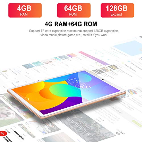 Tablet 10 Pulgadas, Android 10.0 Tablet PC, 4GB RAM y 64GB Memoria, Pantalla IPS HD, Quad-Core 1.5 GHz, WiFi, Dual SIM, Cámara, Netflix, Bluetooth, OTG, 8000 mAH, Certificado por Google GMS -Oro