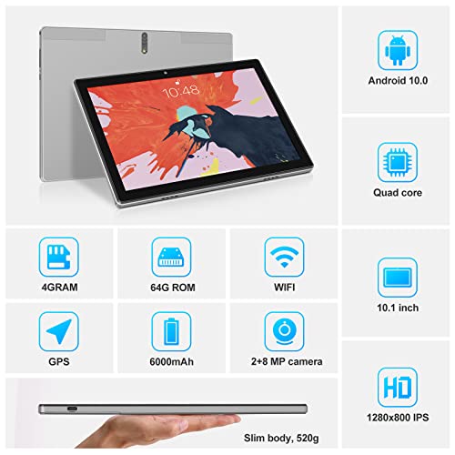 - [Rendimiento mejorado]: Tableta elegante y ultradelgada de 10,1 pulgadas más nueva de 2020, procesador de cuatro núcleos de 1,5 GHz de respuesta rápida, 4 GB de RAM, 64 GB de ROM que garantizan que la mayoría de las aplicaciones de Android se puedan iniciar rápidamente. Ejecute juegos y reproduzca videos sin problemas. El último Android 10.0 puede lograr una multitarea más rápida sin sacrificar el rendimiento.