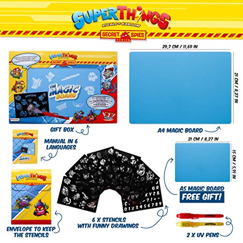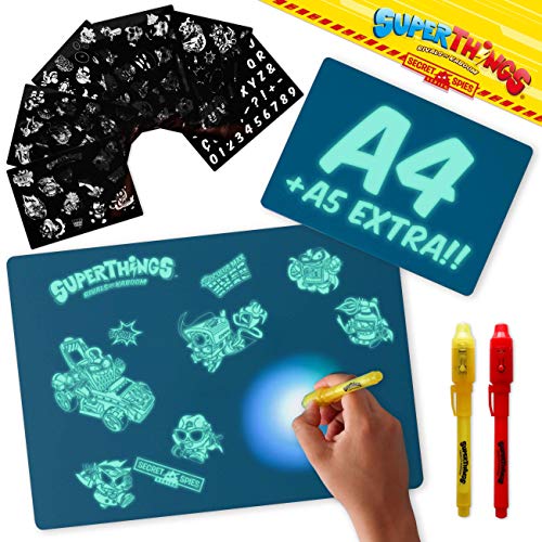 - ? PIZARRA MAGICA A4 Y A5 ? Este juguete original para niños incluye dos pizarras luminosas, una A4 y otra A5 extra. Pizarra mágica infantil tematizada con SuperThings Secret Spies para dibujar con 2 bolis con luz ultravioleta y tinta invisible. Aprieta el botón del bolígrafo espía y aplica la luz sobre la pizarra para dibujar a tus SuperThings de Kaboom City favoritos. Idealmente utilizar en una habitación oscura para una mejor luminosidad de los dibujos