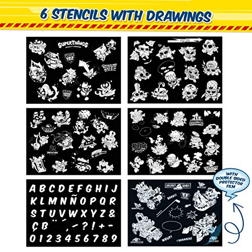 - ? 6 PLANTILLAS A5 CON TUS SUPERTHINGS ? Dibuja a los SuperThings Rivals of Kaboom aplicando la luz ultravioleta sobre ellos. Cada plantilla tiene un tema diferente para que puedas dibujarlos a todos: espías secretos, integrantes de equipos, Spy Jets, SuperThings dorados y plateados y al ultra raro Oculus Max. Regalos originales para niños y niñas de sus coleccionables favoritos para fomentar la creatividad
