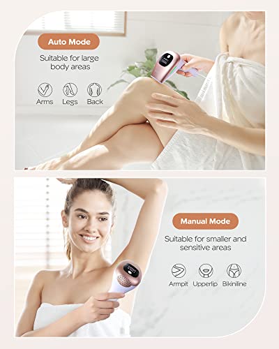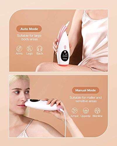- 【5 ajustes de intensidad de luz y 2 modos de flash】 -Este depilador IPL tiene 5 niveles de energía ajustables compatibles con 2 modos para adaptarse a diferentes niveles de sensibilidad. El modo automático ofrece un destello de luz continuo, que es ideal para grandes volúmenes de cabello, como en las piernas, los brazos y la espalda. El modo manual es mejor para regiones sensibles como las líneas del bikini, el labio superior y la axila.