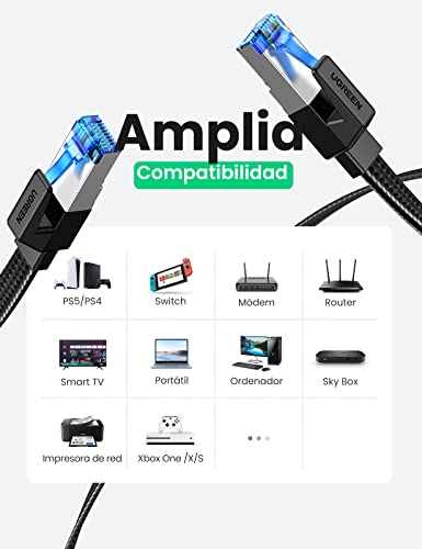 - AMPLIA COMPATIBILIDAD: Este cable categoría 8 que cuenta con conectores RJ45 es compatible con dispositivos con puerto RJ45, tales como PC, Router, Módem, PS5, PS4, PS3, Xbox Series X/S, consolas de videojuegos, TV Box, ect. Compatible con las versiones anteriores de CAT 7, Cat 6a, Cat 6, Cat 5, Cat 5e.(Nota: este cable red sólo sirve para el puerto RJ45, NO sirve para puerto telefónico.)