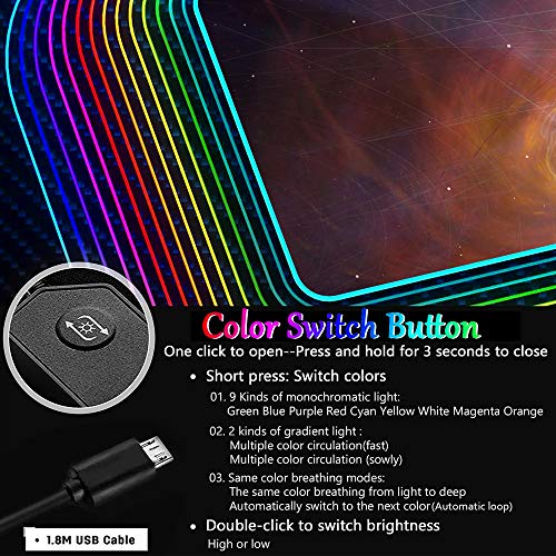 - ★ Fácil de usar, plug and play: la alfombrilla de ratón RGB funciona con un cable USB y funciona sin controlador. Control de un botón diseñado para cambiar los modos de iluminación RGB y el brillo, encendido / apagado, muy conveniente de usar. Los bordes LED lisos y la superficie suave protegerán perfectamente su muñeca. La alfombrilla de ratón DORRIS RGB es la mejor opción de los profesionales de los deportes electrónicos para más.