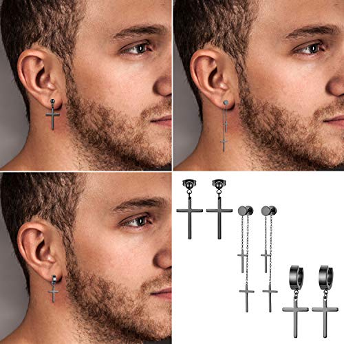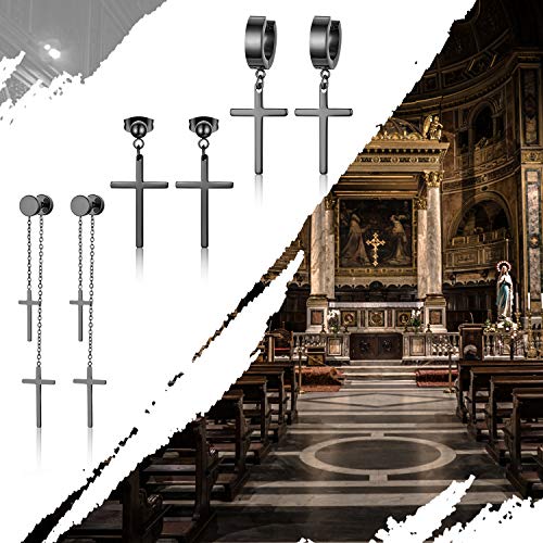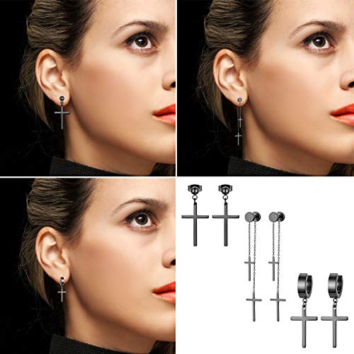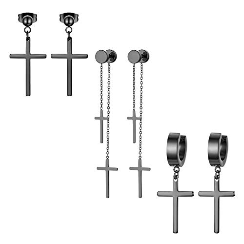 Aroncent Pendientes Negros de La Cruz y Perla Negro Redondo Aretes de Acero Inoxidable con Colgante Largo Diseño Moda Estilo Steam Punk Hip Hop para Mujer Hombre Unisex 3 Pares 6 Piezas Conjuntos