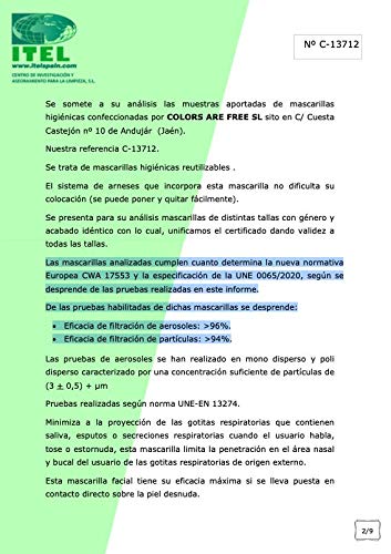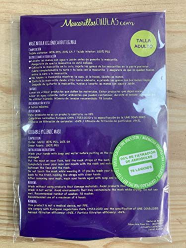 - Mascarilla higiénica reutilizable hasta 70 lavados, con tejido exterior 80% Poliester y 20% Elastano. Tejido interior 100% Poliester
