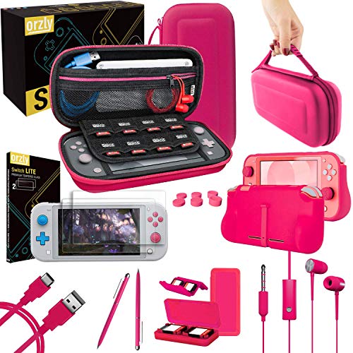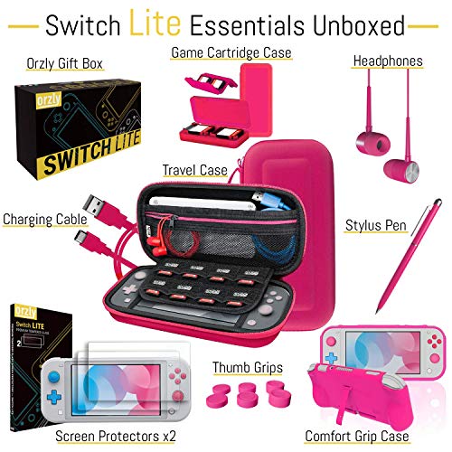 Orzly Paquete de Accesorios para Nintendo Switch Lite – Incluye: Protectores de Pantalla & Funda para Switch Lite Consola, Funda Comfort Grip, Cable USB, Auriculares y más. (Rosa)